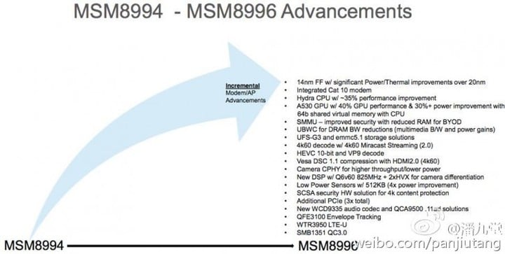分析师潘九堂在微博上放出了这枚新处理器 MSM8996 的详细配置,其中关键信息有: