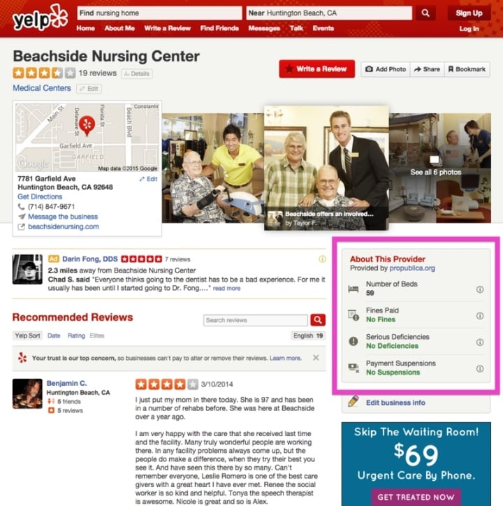 据 Yelp 在官方博客中的介绍,他们还将与非盈利新闻机构 ProPublica 合作已获取有价值的数据支持。ProPublica 是由大量调查记者组成的非盈利机构,其旗下 Centers for Medicare and Medicaid Services (CMS)会跟踪调查全美 4600 家医院、1.5 万家疗养机构和 6300 家诊所,并在每个季度发布一则调查报告,告知人们每家医院的接诊效率,病房、病床状况,医护人员服务态度等信息。