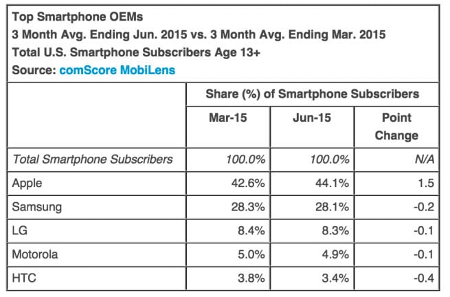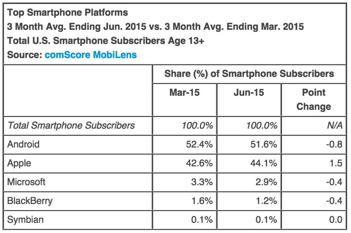 市场调研机构 comScore 公布了最近的美国智能手机市场数据,首先看到的是各厂商的市场份额对比。