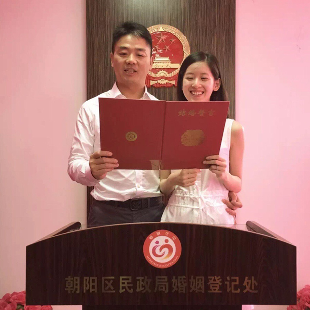 8 月 8 日,京东 CEO 刘强东与“奶茶妹”章泽天领证结婚的消息被曝出。该消息传出的前一天,因京东亏损 5 亿元,刘强东宣布年薪降为 1 元。图为刘强东与章泽天领证秀恩爱(图片来自新浪微博)。