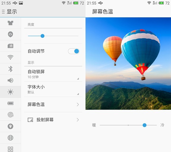 点亮屏幕,Super AMOLED 的高饱和度色彩立马开始吸引眼球。魅族官方宣传这块屏幕的 NTSC 色域 100%,而且没有了早期 Super AMOLED 过于偏绿的问题。默认模式下,色温也接近标准,甚至在看惯了偏冷的屏幕调试风格以后,第一眼看到 MX5 这块屏幕会觉得有点偏暖了。如果要想让屏幕显得色温高一些,可以在设置里调节。
