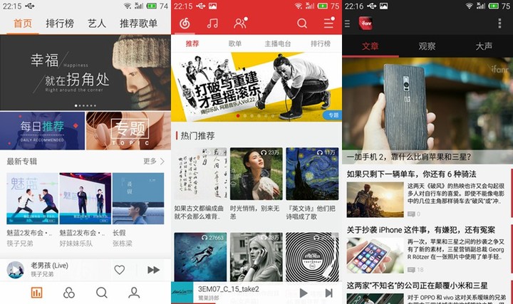 (分别为系统自带“音乐”、网易云音乐、爱范儿三款应用,皆为沉浸式状态栏)