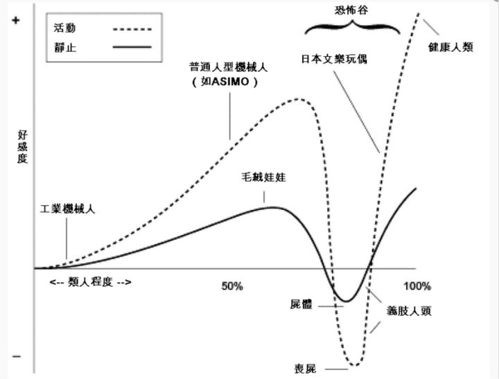 机器人专家森政弘在 1970 年曾经提出过一个恐怖谷理论(uncanny valley)。该理论认为,由于机器人与人类在外表、动作上都非常相似,所以人类会对机器人产生正面的情感;但到了一个特定程度,他们就会突然对机器人很反感;但如果相似度继续上升,反感就又会上升为好感。如图。