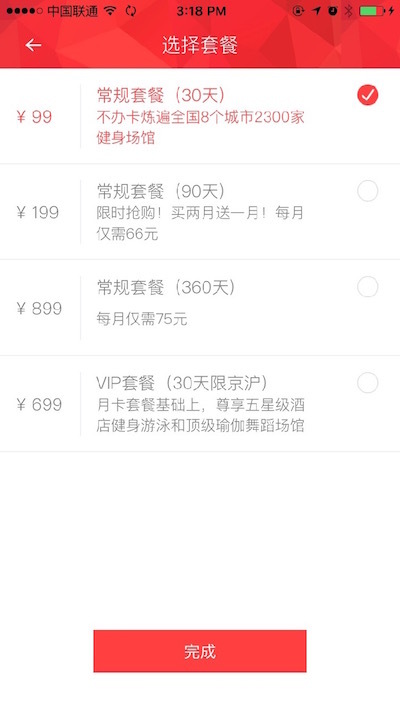 全城热炼提供的服务并不难理解。用户通过 app 购买了相应的套餐之后,就可以到和全城热炼合作的场馆当中去健身,每个场馆可以去三次。除了 99 元的“月卡”套餐外,app 还提供了 199 元的高级月卡套餐,899 元的年卡套餐以及 699 元的尊贵月卡套餐。