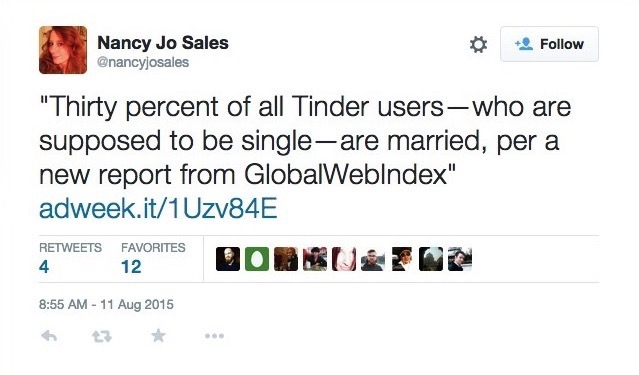 本来 Tinder 也还挺淡定,直到周二,Sales 在 Twitter 上转发了一则数据,“30% 的 Tinder 用户是已婚人士”。这一下 Tinder 就不能忍了,这不仅是对伟大社交事业不公的评判,还影响了社交媒体上极为重要的“道德正确性”。约炮在西方已经是流行文化,但为已婚人士打开出轨的窗户就……