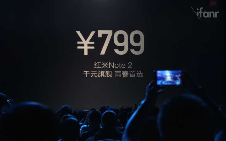8 月 13 日下午,小米在北京举行发布会,发布了 MIUI 7 及手机硬件新品红米 Note 2。采用了 MT6795 Soc 的红米 Note 2 售价为 799 元,而采用相同 Soc 的 HTC One M9+ 上市价格逾 4000 元。相比之下,红米 Note 2 的性价比凸显。图为小米发布会现场,红米 Note 2 的售价公布时刻。