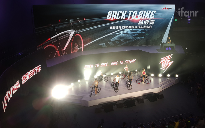 8 月 11 日晚,乐视发布了三款“超级自行车”,价格最高的镀金款售价高达 39999 元。继智能手环和手表之后,自行车要成为智能化的下一领域?图为乐视超级自行车发布会现场。