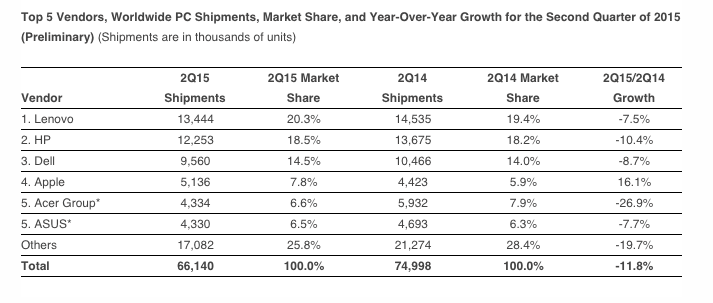 而在 Windows 10 发布前的 2015 年第二季度,根据 IDC 的统计,全球 PC 市场的出货量滑坡幅度为 11.8%,略高于预期。统计并未计入搭载 x86 处理器的 PC 平板电脑。出货量位居前五名的品牌分别是联想、惠普、戴尔、苹果、宏碁。苹果是其中唯一实现出货量上涨的品牌,同比上涨 16.1%。而华硕以相近的出货量和宏碁并列第五,同比下降 7.7%。