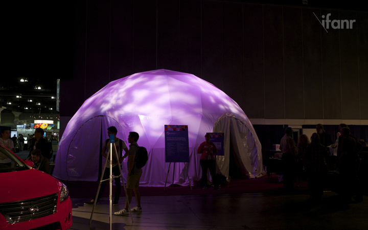 在遍地是展台的展会搭建一个帐篷,总是会吸引人过去看看。进去后你就会发现,他们实现虚拟现实的方式非常浪漫:直接用投影仪将画面投射在球状的帐篷顶部,除了后排的座椅,前排位置地上放着许多懒人沙发,观众可以躺在那上面,由于视野足够宽广,观众目之所及都是他们投射的画面,而且帐篷内还有空间可以摆放专业级音响设备,在听觉上也可以营造极佳的效果。