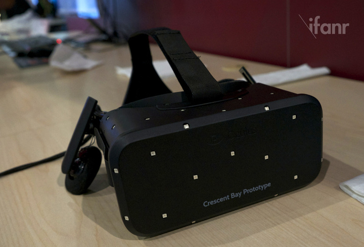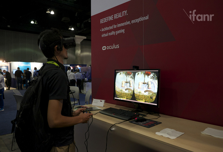 在 SIGGRAPH 闲逛的时候,我还看到了大名鼎鼎的 Oculus 头盔,这次出场的是 Oculus Crescent Bay 的原型机,通过 USB 和 HDMI 这两条线连接到电脑上,前者负责启动传感器,后者负责视频信号传输。它出现在 AMD 展台,因为所连接的电脑上则配备了 AMD Radeon R9 Fury X。