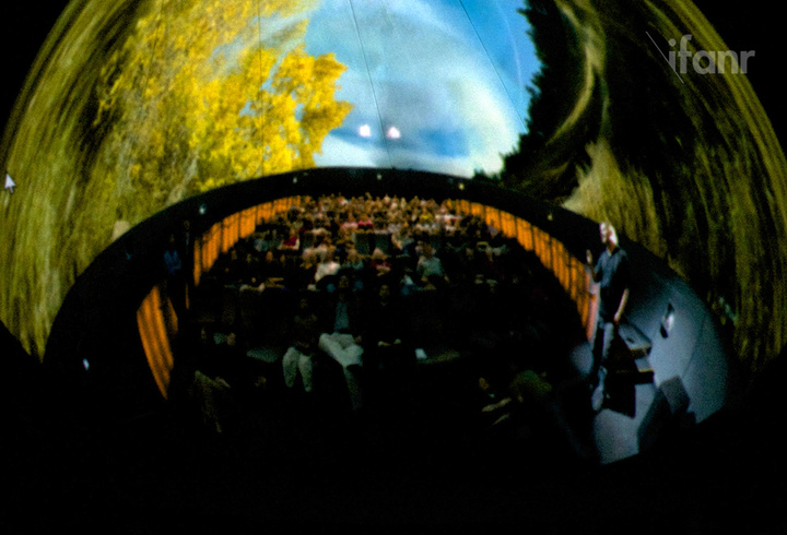这种虚拟现实体验方式最大优点就是惬意,不用头盔,不用耳机,你唯一需要带上的东西就是你的眼睛和耳朵,就那样躺在地上看着天花板上投射的蓝天白云,仿佛就来到了大草原,真的非常舒服。不过,由于是投射在球形帐篷上,视频的拍摄也需要一些特殊的处理,例如需要用特制的拍摄设备,投影的时候也需要运用 3D 投影技术。