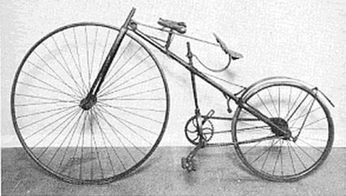 这是第一辆双脚可以离地的自行车,同时也是第一辆后轮驱动的自行车。他在车架的两侧靠近脚的位置安装了两个连杆,一端连接着后轮,而另外一端则连接着最原始的脚踏板。