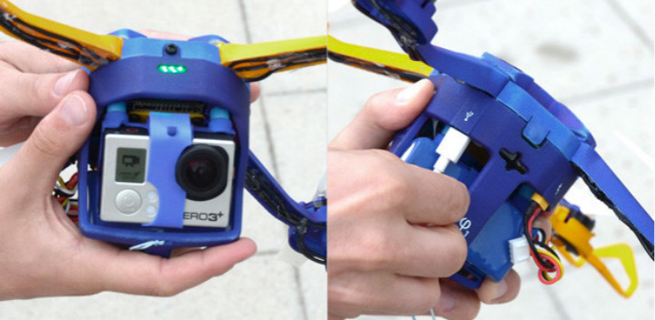 飞行器中含 GoPro 相机,按下 FotoKite 电源开关即可启动;相机上的 USB 插口可供充电。