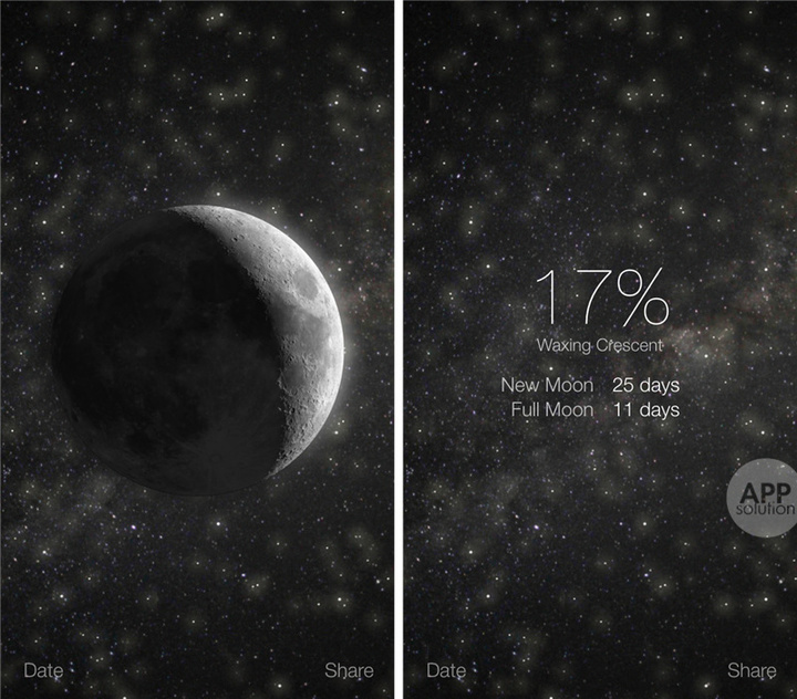 打开这款叫做 Moon 的应用,你会被一个庞大的月亮所吸引,而这个大月亮的模样就是今晚的月相。此外,通过左下角的 Date 按钮,设定好日期后,还能查看到过去或未来某天的月相。如果你刚好有暗恋的人,不如将日期调到明年的 2 月 14 日,截屏发给 TA,别忘了附上一句“这天我想和你一起看月亮。”