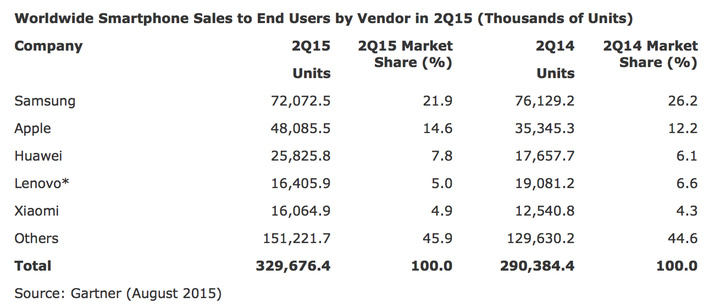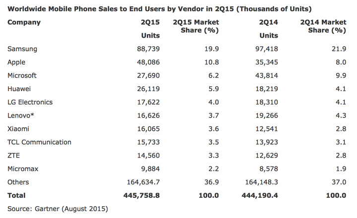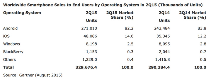 这只是 Gartner 最新的 2015 Q2 手机市场调研报告中的一个数据。整体而言,报告比之于往常并没有太大的变化。Android 和 iOS 继续双王称霸,黑莓的市场份额还在萎缩,微软的 Windows Phone 一如既往处于被边缘化的状态。