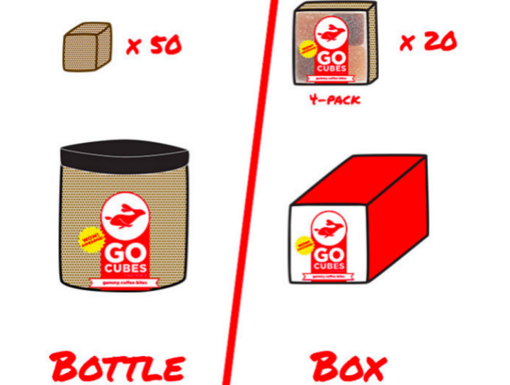 Go Cubes 现在有两种包装,如图所示。瓶装 50 片,售价 32 美元;盒装 80 片,售价 50 美元。订阅情况不同,价钱也有差别。