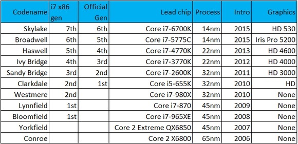 对于英特尔为什么要把图形核心作为第一代处理器的划分线,Gordon 也没问出个所以然来。为了减少读者的困惑,Gordon 呈现了一张表格: