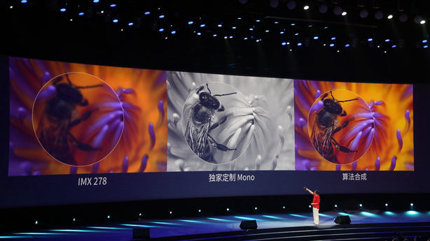 后置双 1300 万像素摄像头,一枚 CMOS 为索尼 IMX 278,负责采集色彩信号;另一枚 CMOS 为向索尼定制的黑白感光元件,负责记录轮廓。镜头光圈为 F1.8。