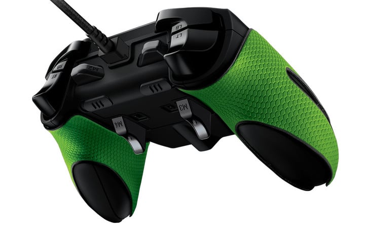 野猫手柄背后也另有乾坤,雷蛇宣称背后的铝制触发器是“飞行器级别”的,并且还是可拆卸,所以就按键布局来说,这款野猫要比标配的 Xbox One 手柄复杂很多。当然,作为雷蛇出品,大片的绿色是少不了的,不过这里雷蛇提供的是可 DIY 粘贴的橡胶垫,