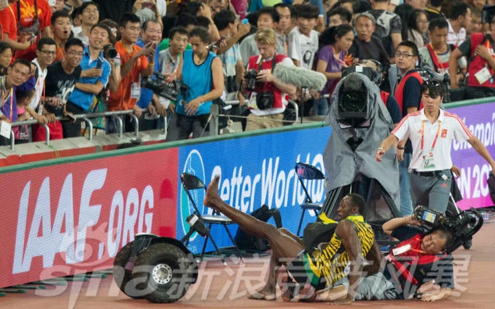 8 月 27 日晚,鸟巢,博尔特获得男子 200 米世锦赛冠军。他在赛场边庆祝时,一位驾着平衡车跟在博尔特身后进行拍摄的摄影师,突然因失去平衡绊倒了博尔特。平衡车,这种日渐普及的科技产品,在方便各种专业人士时,也在不经意间,造就了“比博尔特还快的男人(微博网友评论)”。(图片来自新浪体育)