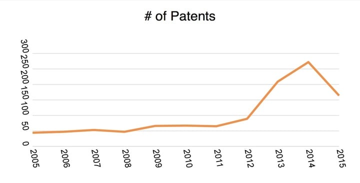 SmartUp Legal 是一个在线知识产权平台,它统计了过去十年中科技公司获得的汽车相关专利。整体而言,自 2013 年起,科技公司注册汽车相关专利有一个小爆发,三星以及 Google 的汽车相关专利都翻倍增长。