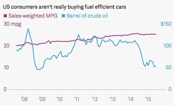 QZ 发现了一个有趣的现象:大排量的大型车是最受美国消费者欢迎的,但总体上美国汽车也在变得越来越环保。