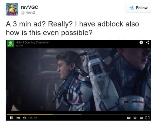 前两天 Twitter 上有网友发出推文:“3 分钟的广告?真的吗?我开着拦截器,这怎么可能?”网友说的这段三分钟广告里,“跳过”按钮被移除了,有点儿惩罚拦截器用户的意味。