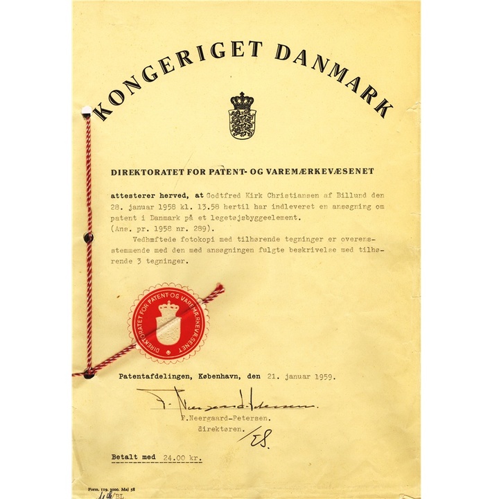 这位谦逊、和善同时又时刻保持创业精神的老人最终于 1958 年 3 月 11日病逝,但幸运的是在 Godtfred 的积极推动下,老人在临终前得见 Lego 积木拿到了丹麦专利局的专利证明。