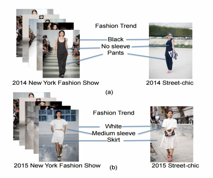 - 时装秀的影响:数据表明,大多数情况下,人们都倾向于模仿时装秀中的衣服款式;偶有例外,比如 2014 年街头时尚服装中,过膝的裤子和长袖衣服受欢迎程度出现了上升。团队猜测,可能是因为那年夏天相对较冷,人们有保暖需求。