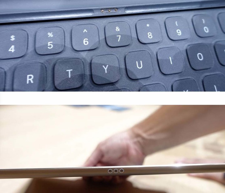 售价 169 美元的 Smart Keyboard 通过 iPad Pro 边缘的三颗触点连接。键盘本身没有内置电池模块,完全靠 iPad 供电。