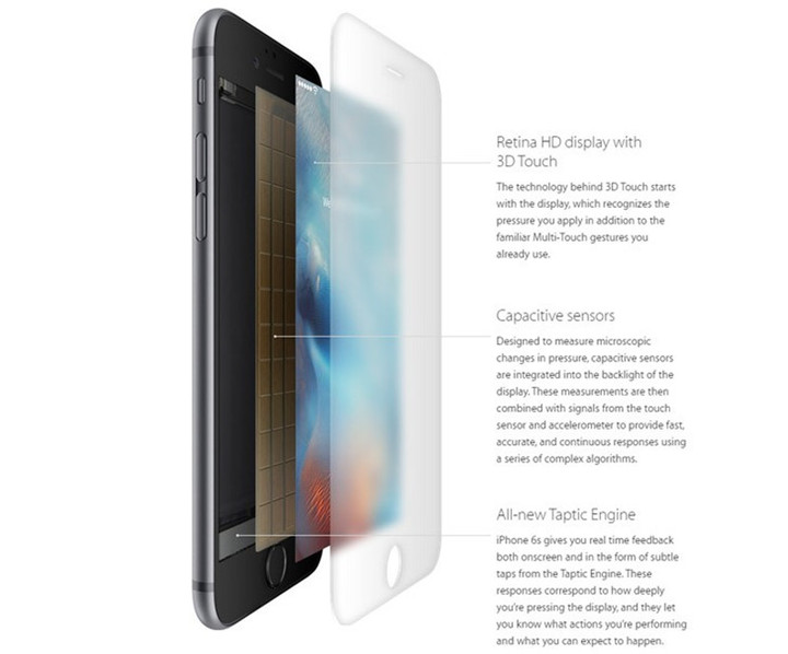 何为 3D Touch?其实就是年初 Macbook 系列那个 ForceTouch 触控板技术的触摸屏版本。也就是说,你以前可以用长按和短按(点击)和设备交互,其功能的实现主要是依赖于屏幕底下的电容传感器,它集成在显示屏的背光层中,用来测量压力的细微变化。得到的测量结果随后与触摸感应器和加速感应器发送的信号相结合,通过一系列复杂的计算,提供快速、准确和持续的响应。在 Macbook 上可通过摁住来实现新的功能。比如摁住查看预览或网页字词翻译等。这一次,iPhone 能够感应你按压屏幕的力度。除了轻点、轻扫、双指开合这些熟悉的手势之外,3D Touch 还带来了 Peek 和 Pop,为 iPhone 的使用体验开拓出全新的维度。而且,当你使用 3D Touch 时,iPhone 将回以轻微的触感,让用户不仅能够看到按下屏幕的操作效果,还能感觉得到。