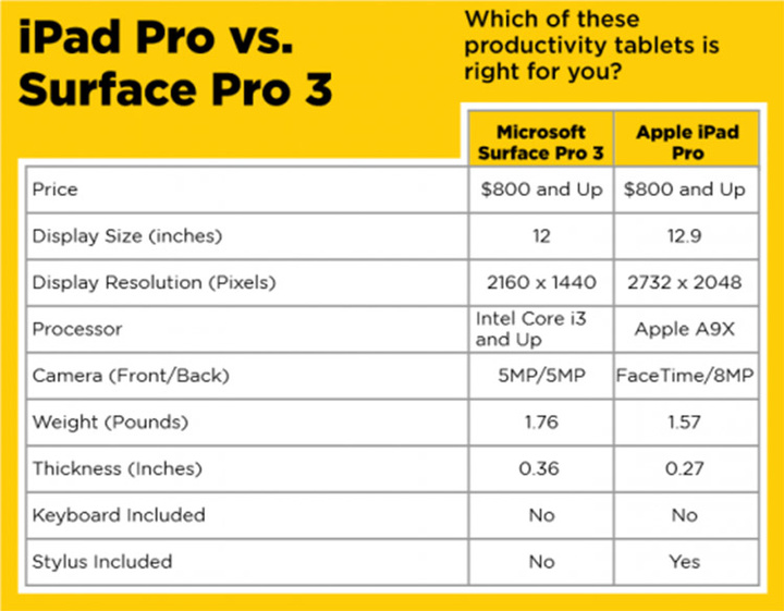 Laptopmag 给出了两款产品的基础信息对比,iPad Pro 是 iPad 产品线上最大屏幕硬件,拥有 12.9 英寸的显示屏,分辨率为 2732 * 2048;而 Surface Pro 3 的屏幕为 12 英寸,分辨率为 2160 * 1440.