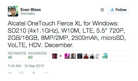 根据爆料大神 Evleaks 在 Twitter 上提供的消息,即将搭载 Windows 10 系统的手机型号为 Alcatel OneTouch Fierce XL。该款手机将配备 5.5 英寸 720 p 显示屏,搭载高通骁龙 210 处理器,拥有 16 GB 的储存空间和 2GB RAM。拍照方面则是一颗 800 万像素的主摄像头和 200 万像素的前置摄像头。电池容量则为 2500 mAH。