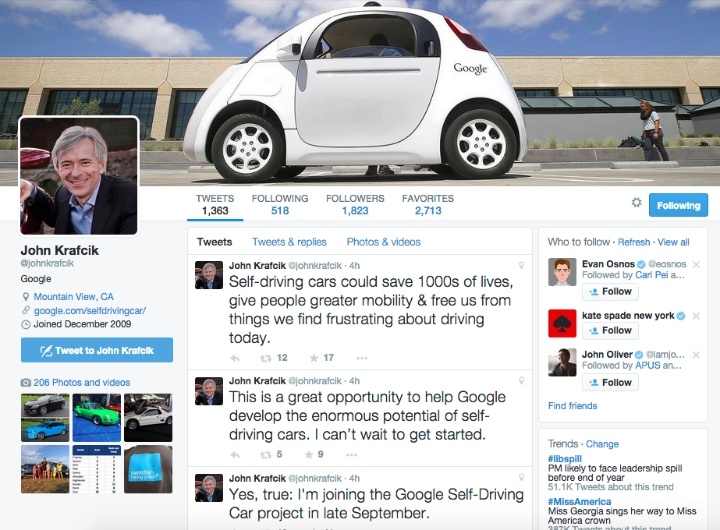 John Krafcik LinkedIn 上当前的职位状态还是 TrueCar 的总裁,但其个人 Twitter 上的简介则已标上 Google。看得出 John Krafcik 对加入 Google 无人汽车项目也很兴奋。除了主页照片已换成 Google 无人汽车图片,他还连发 3 条 Twitter,不仅宣布了其加盟 Google 的消息,还表示自己已经迫不及待要去挖掘无人驾驶汽车的最大潜力。
