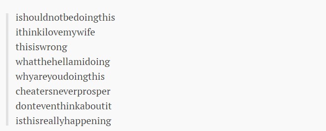 还有些带着负罪感的纠结青年,在密码里写着愧疚之辞:“我不应该这么做”、“我 TM 在干啥”、“我想我爱我的老婆”、“这是错的”……