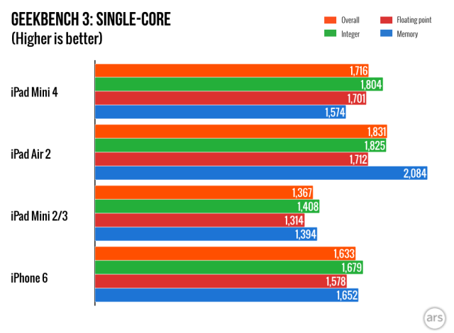 从 Arstechnica 一同曝出的 iPad mini 4 与 iPad Air 2(A8X 处理器)、iPad mini 2/3(A7 处理器)以及 iPhone 6(A8 处理器)跑分对比图来看,这种说法也是比较靠谱的。iPad mini 4 的跑分整体(包括单核和多核)略高于同处理器的 iPhone 6,弱于采用 A8X 三核心处理器的 iPad Air 2。
