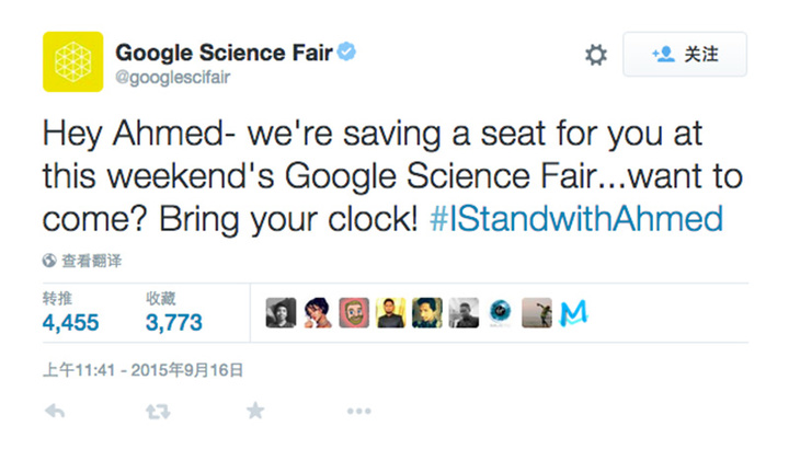 当然科技媒体头条还不是主要的,Ahmed Mohamed 在 Twitter 上得到了众多大 V 名人的鼓励,一时之间,#IStandWithAhmed 话题迅速升温,Ahmed Mohamed 成了头条。