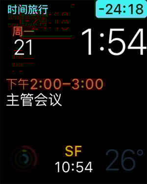 而“时间旅行”功能允许你拧动数码表冠查看过去和未来的事件以及天气,有些类似时间轴,快速的查看日程信息。