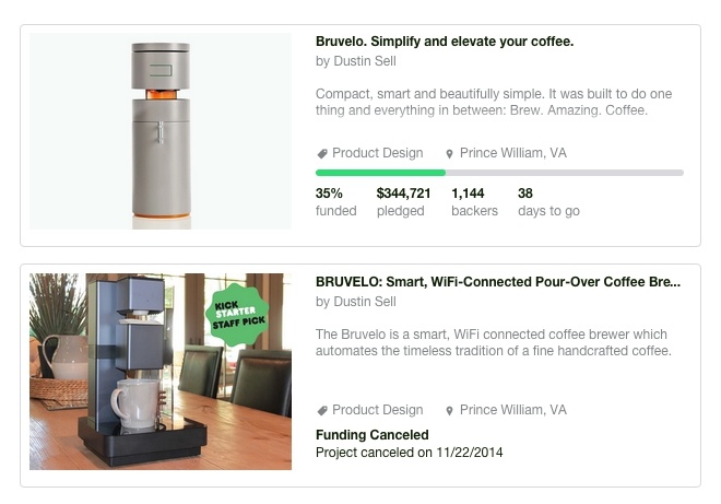 Dustin Sell 去年研发的咖啡机 Bruvelo 曾在 Kickstarter 上获得不少(15 万美元)支持,但由于发现其制作成本太高,发布没几个月 Dustin Sell 就停止了该众筹项目。经过不到一年的改进后,新的 Bruvelo 预计售价为 419 美元,Kickstarter 上的早鸟价为 299 美元。