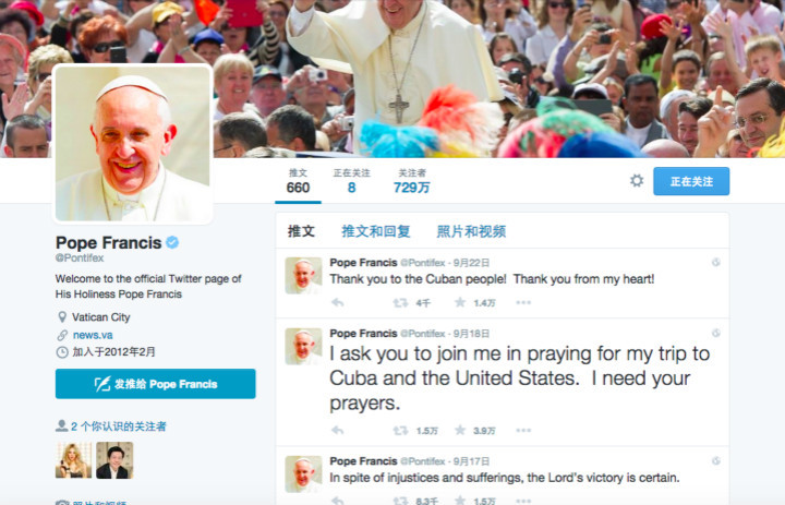 最近一段时间以来,网络上铺天盖地都是教皇的消息:“教皇来美国了”、“教皇来古巴了”、教皇发表演讲了、教皇主持大会了、教皇又收获一堆小粉丝了……