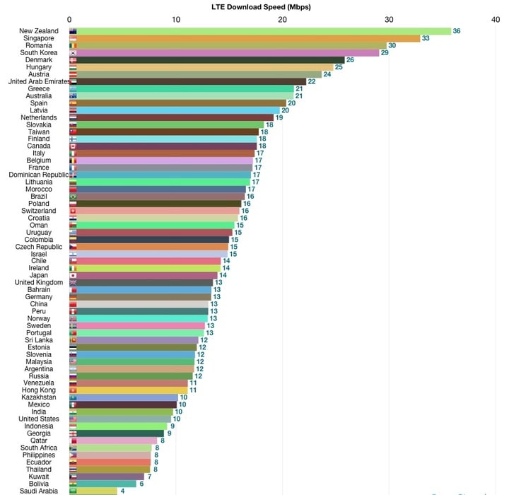 4G LTE 覆盖率为 78% 的美国只以 10Mbps 的速度排名第 55 位。中国大陆 4G 网络的覆盖率也有 76%,下载速度则为 13Mbps,排名第 38 位。