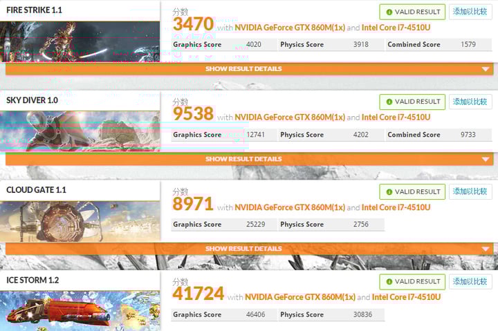 至于 GTX750Ti 这块显卡,算是台式机里中端产品,在 3DMark 中,这块显卡被识别成了 GTX 860M,虽然后面又带了 M,不过基本可以视为和 GTX 750Ti 是同一块显卡,只是桌面用的本体和笔记本用的马甲版而已。