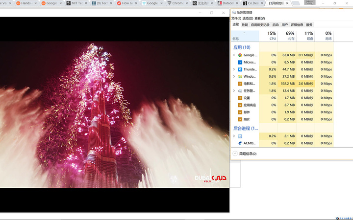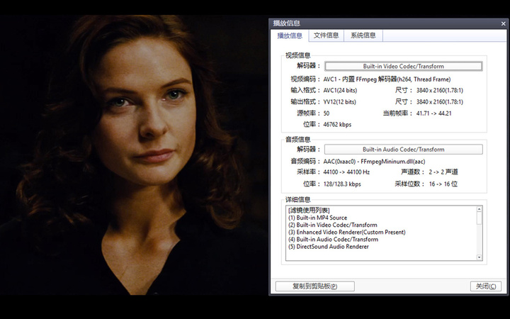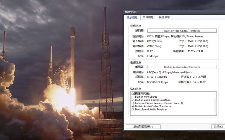 4K 视频的播放测试,我选取了三个视频片段,《迪拜焰火》、《碟中谍 5》预告、《世界遗产》,帧率分别为 23、50 和 60,对应的码率则是 17212Kbps、45432Kbps、12860Kbps。