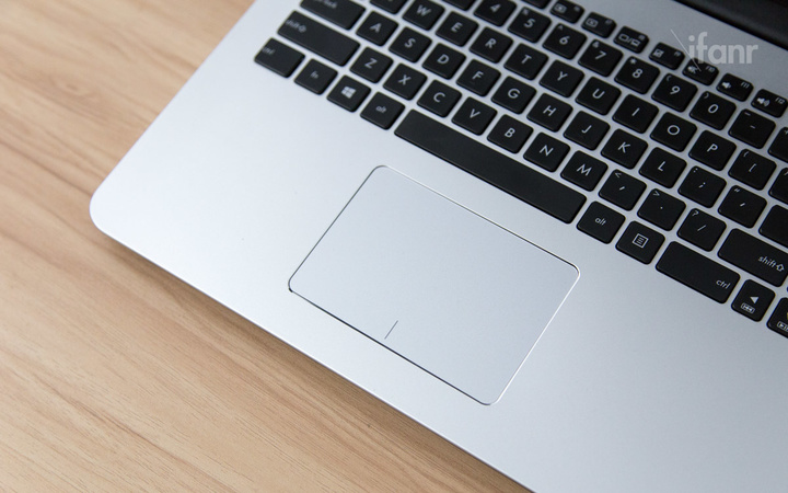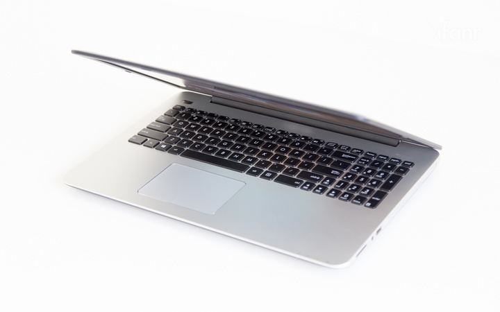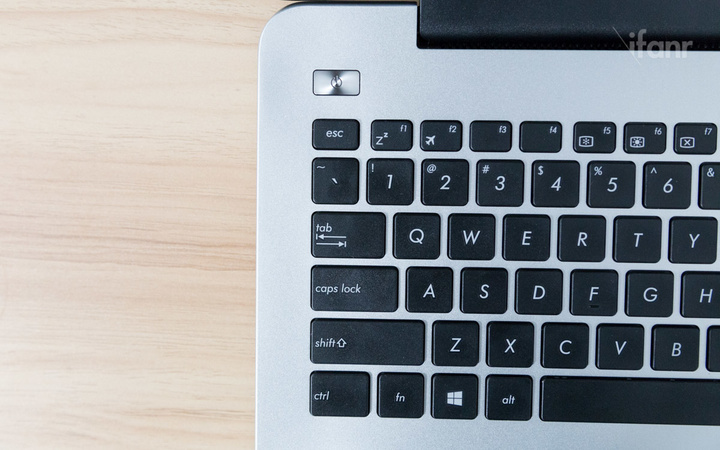 C 面是一整块铝合金,除了六列的巧克力键盘,以及宽大的触控板外,没有任何多余的装饰和线条。电源键位于键盘左上角,右上角则是华硕标志性的“SonicMaster”音效标志。