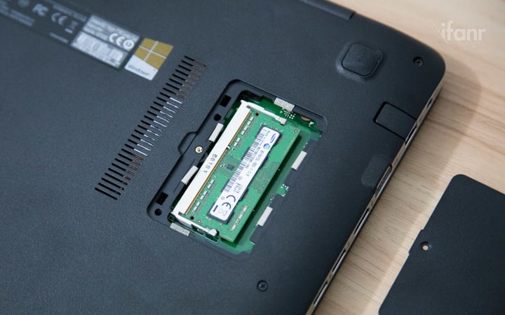 从侧边看,整机呈三明治结构,第一层是蓝色的顶壳,第二层是银色的铝合金结构,第三层,也就是机身背面则是黑色的工程塑料制底壳。机身背面有一个可供拆卸的小窗,用以更换内存条。手头这款机型为 8GB 内存款,其中板载 4GB,另外一个插槽安置了一根 4GB 内存条,可以手动更换为单条 8GB 内存,而这也是华硕 VivoBook 4000 所支持的最大内存了,应付一般的影音娱乐也足够用的了。