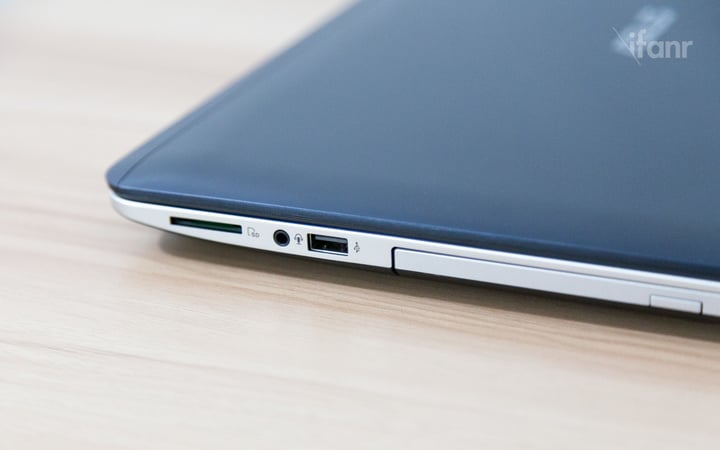 华硕这款 VivoBook 4000 共有三个 USB 接口,其中左侧两个为 USB 3.0,右侧一个 USB 2.0。另外还有 VGA、HDMI、RJ 45 网线接口各一个。而就我个人而言,比较贴心的则是机身右侧靠近前端的这一个读卡器。