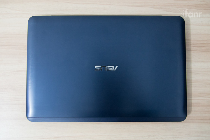 外观一如图片所示,设计上并不张扬,更多的是低调内敛。顶壳,也就是常说的 A 面,是深蓝色涂装的铝合金材质,上面印着比较细腻的拉丝纹路,上端有一长条分割线,内部安放着射频天线。正中的位置印着华硕的 ASUS 亮银色 logo。