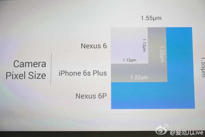 Nexus 6P 的摄像头采用了索尼的 1230 万 CMOS ,并且支持激光对焦,而发布会上,Google 一直强调的是 Nexus 6P 的主相机单像素尺寸为 1.55μm,而像素值相近的 iPhone 6s Plus 为 1.22μm。一般来说,更大的单位像素面积能带来更好的弱光拍照效果。