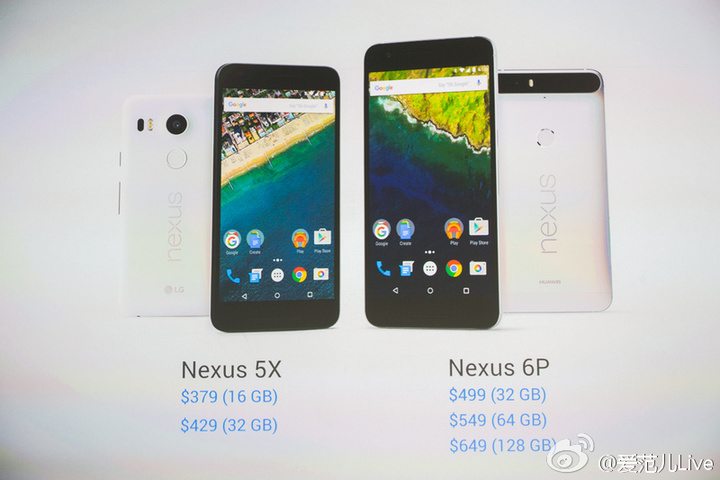 Nexus 5X 起售价 379 美元(16GB),32GB 售价 429 美元;Nexus 6P,32GB 售价 499 美元,64GB 售价 549 美元,128GB 售价 649 美元。