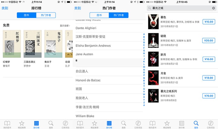 iBooks Store 联合了国内 20 多家出版社为用户提供丰富的付费和免费中文图书。此前苹果在 iBooks Store 提供了很多古典名著方面的图书,这样造成的市场状况是,几乎没有几个用户在使用这款应用,而这次苹果希望用丰富内容的方式提高这款应用的竞争力。
